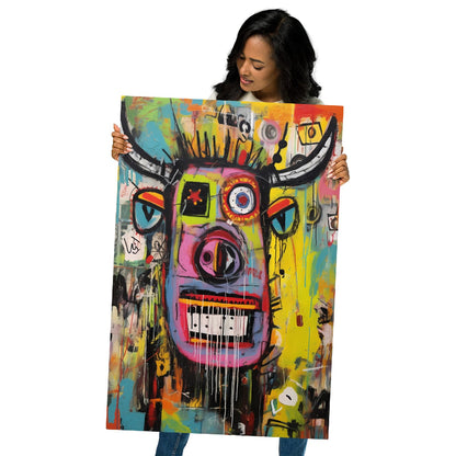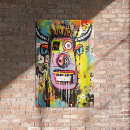 This print doesn’t try to be polite décor. It’s a front-facing horned portrait that feels like it was lifted from a city wall: loud color blocks, heavy black strokes, raw texture, and paint that “runs” in long drips. The horns stretch wide like a frame, the crown area is a burst of spiky marks, and the face is built from layered panels — lime, magenta, violet, and charcoal — stacked like posters that have been pasted and repainted for years.
