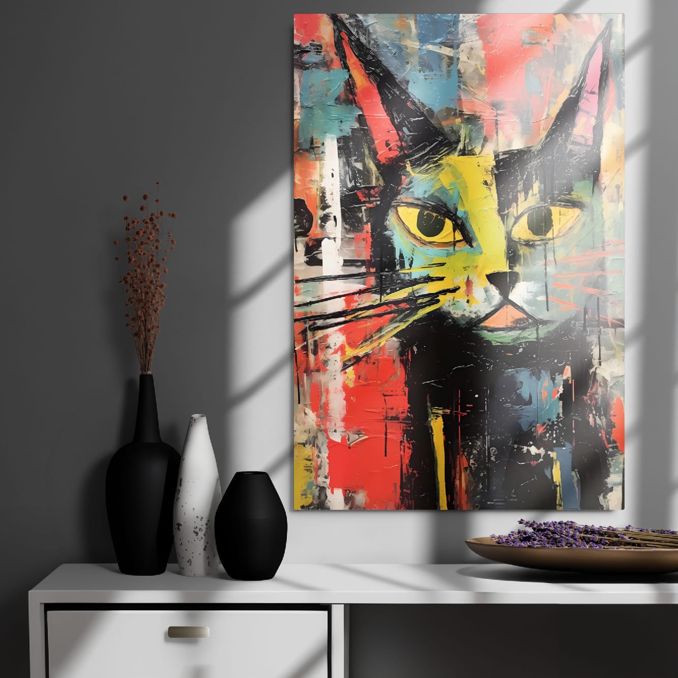 The cat has always been a symbol of mystery, independence, and nocturnal energy. In "Vivid Feline", these traits are amplified through a lens of neo-expressionism. The jagged whiskers, the asymmetrical ears, and the piercing, sun-bright eyes create a presence that is both comforting and slightly provocative. This is why people choose to buy posters online that carry a specific weight — not physical weight, but emotional gravity. When you choose decorative metal art for walls, you are making a statement that you value longevity, depth, and a touch of the avant-garde.